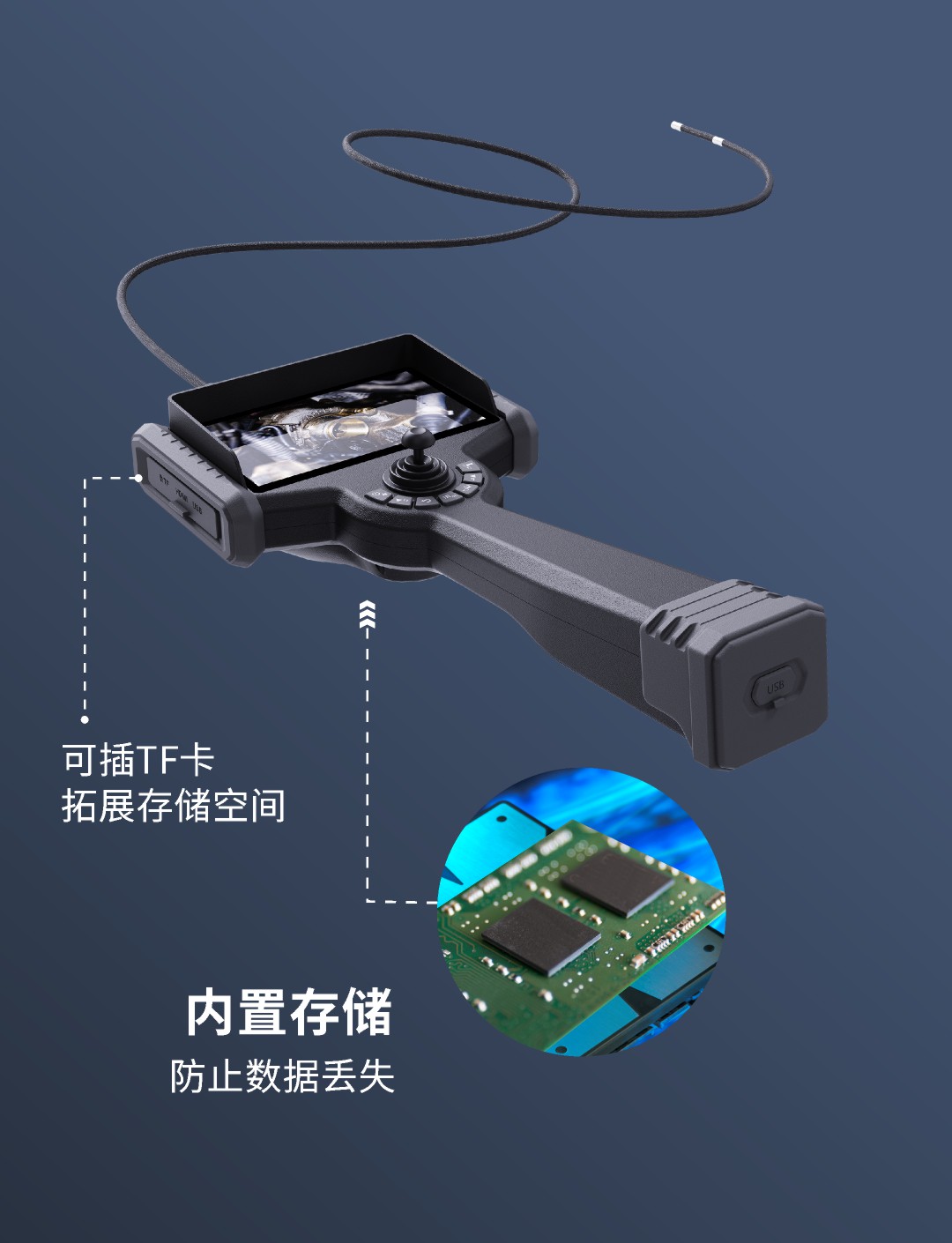 優(yōu)勢特點:紅白雙光源;6英寸大屏;雙電路設(shè)計,單節(jié)電池也能工作;360°旋轉(zhuǎn)探頭